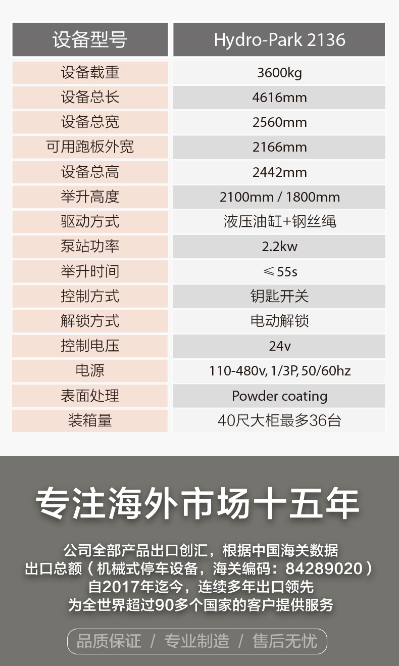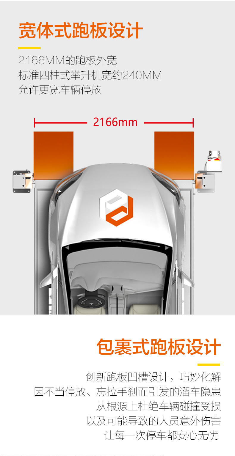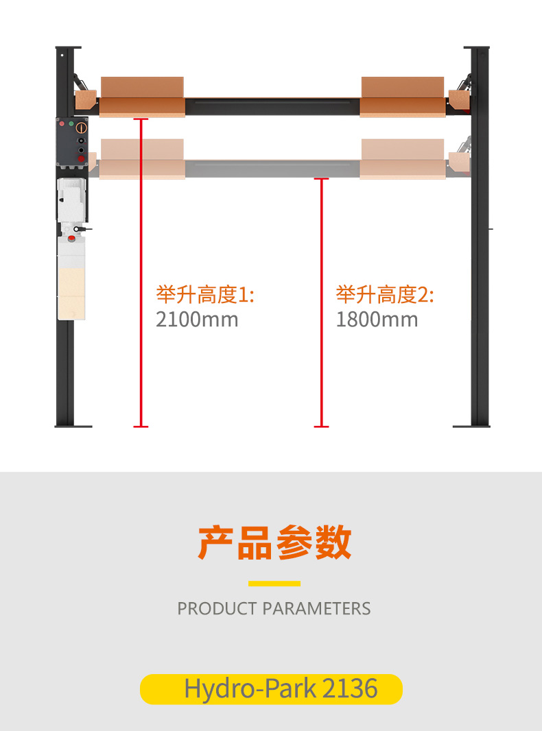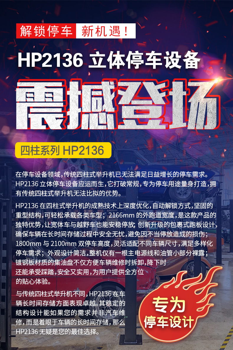 HP2136在傳統(tǒng)四柱式舉升機的成熟技術上深度優(yōu)化,專為停車和長時存車用途量身打造。標配自動解鎖方式,載重3600kg,跑板外寬增加至2166mm,停車高度2100mm,同時標配熱鍍鋅材質的高強度接油盤,兼具停車和修車功能。