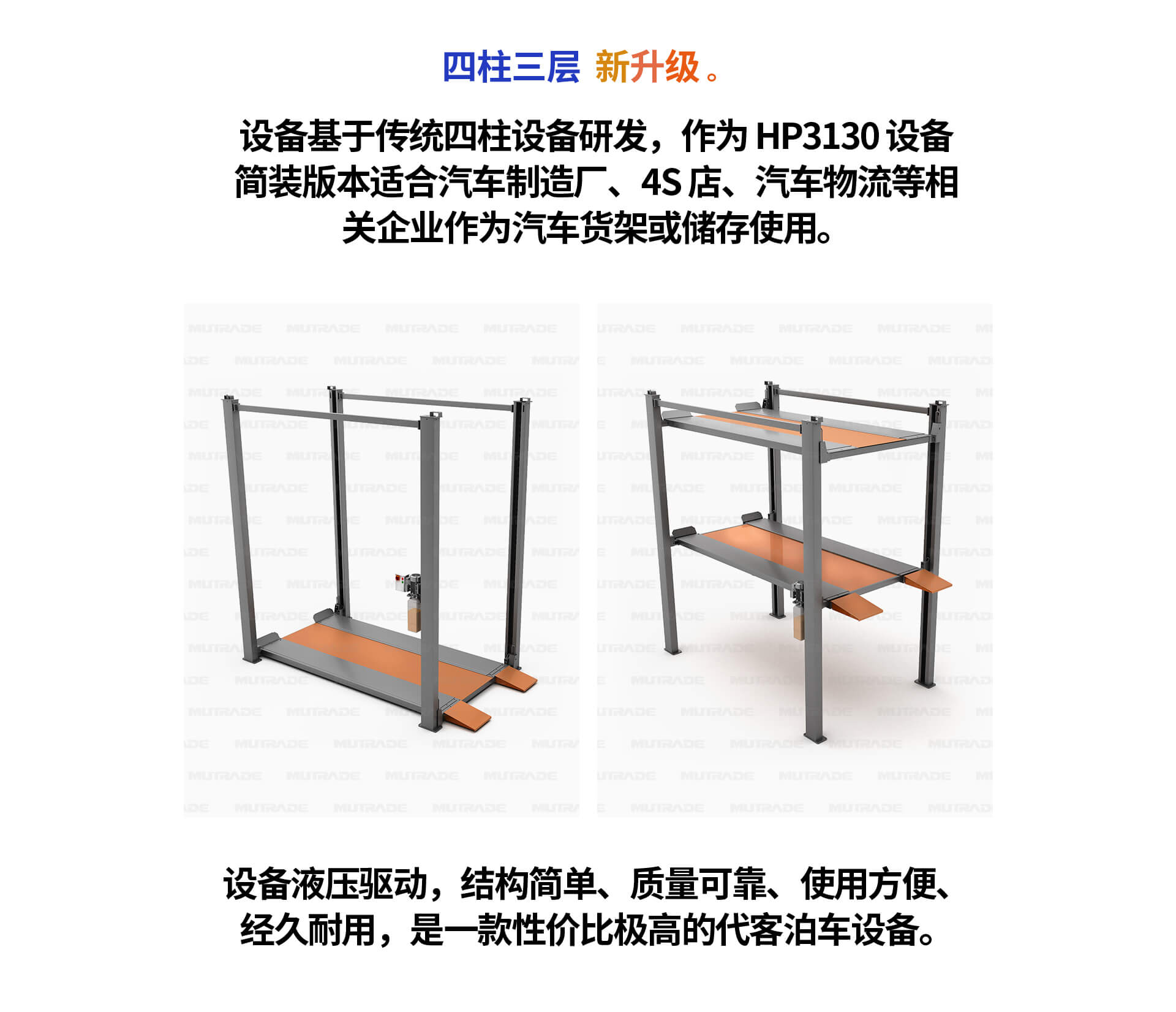 四柱系列HP3130系列產(chǎn)品是由我司研發(fā)生產(chǎn)的簡(jiǎn)易類疊板停車設(shè)備。設(shè)備在過(guò)去10年中行銷歐、美等發(fā)達(dá)國(guó)家,累計(jì)銷售2000余臺(tái)。